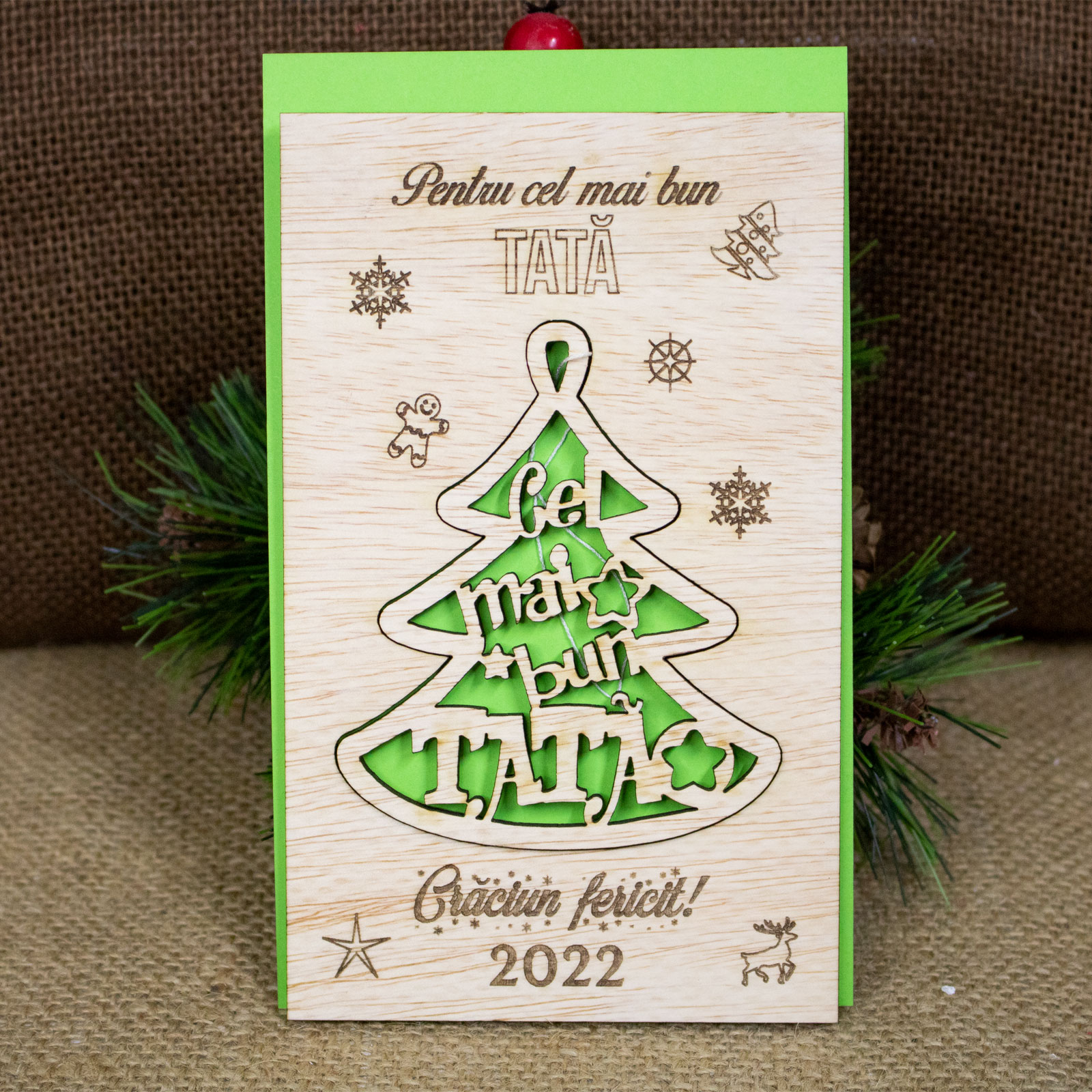 Daca esti din Oradea, te primim cu drag in atelierul nostru de unde poti ridica Felicitare de Craciun din lemn, personalizata „Cel mai bun tata”