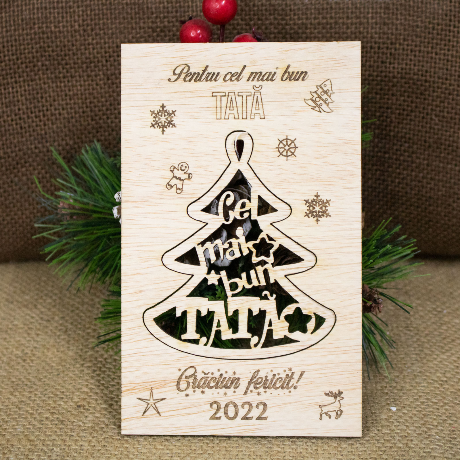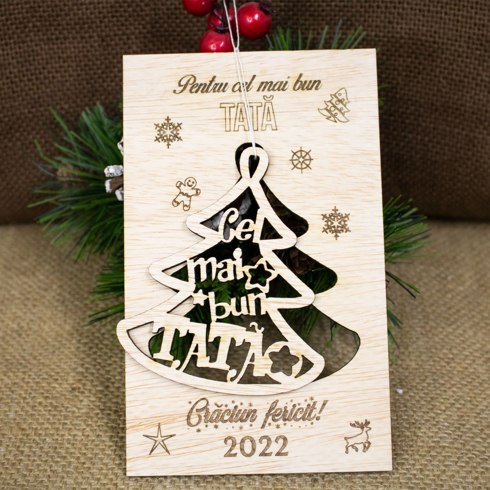 Produsul Felicitare de Craciun din lemn, personalizata „Cel mai bun tata” contine o felicitare cu text personalizabil