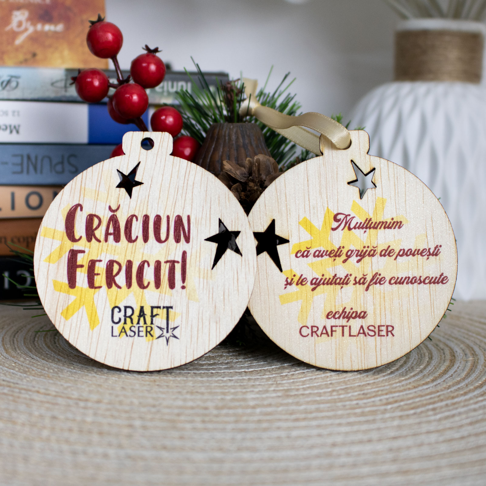Fă ca fiecare brad să spună o poveste! Globurile noastre sunt realizate din lemn natural de 4 mm grosime, gravate cu grijă și personalizate exact așa cum îți dorești.