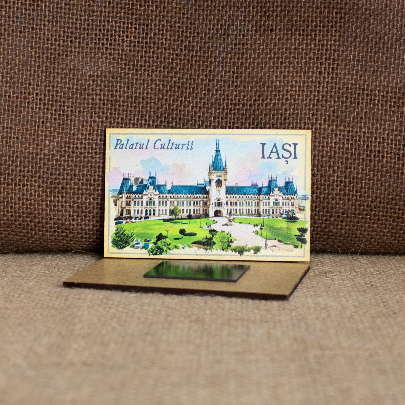 Magnet de frigider din lemn, acuarela, Palatul Culturii Iasi este realizat local, în atelierul Craftlaser din Oradea, din materiale naturale, folosind tehnici de printare durabile.