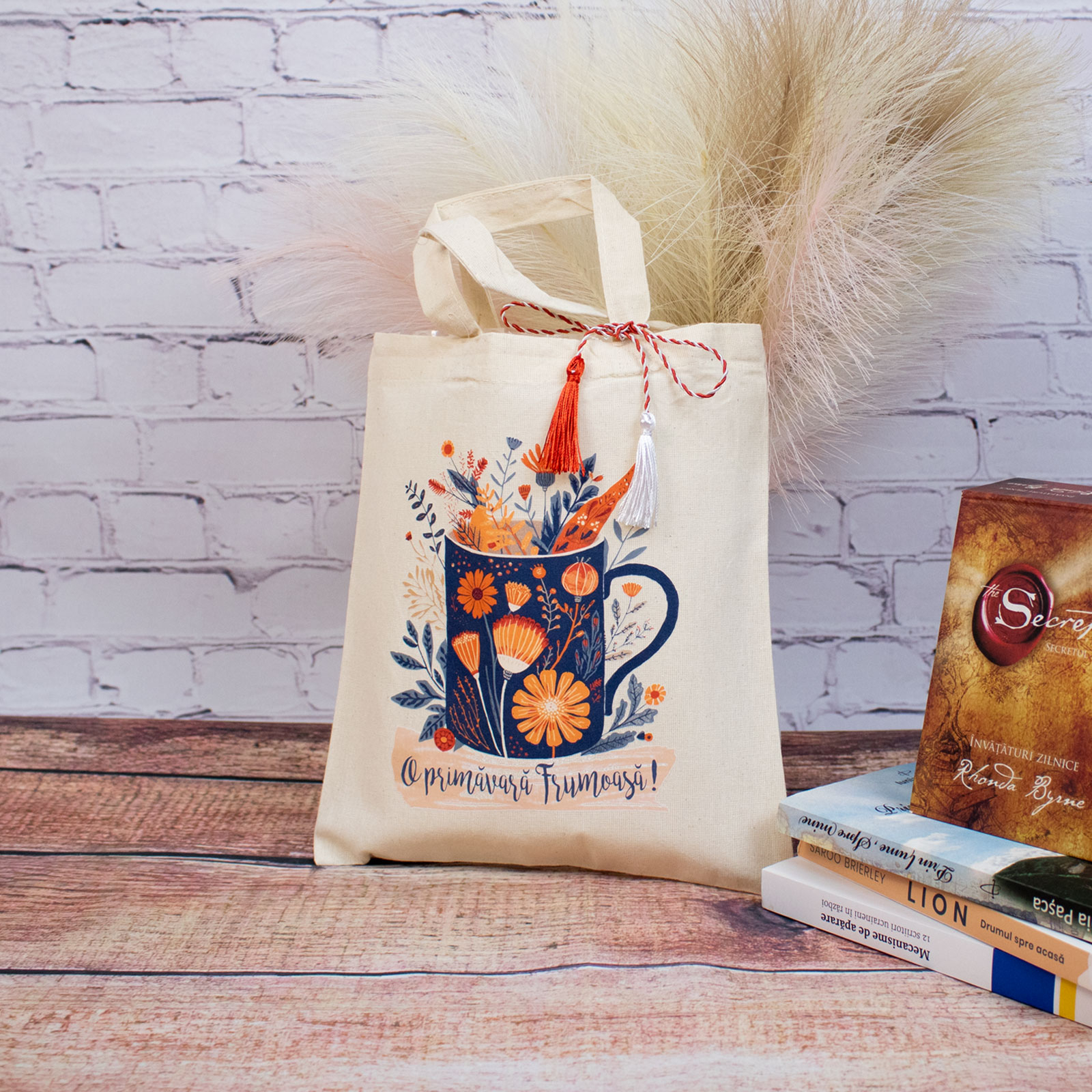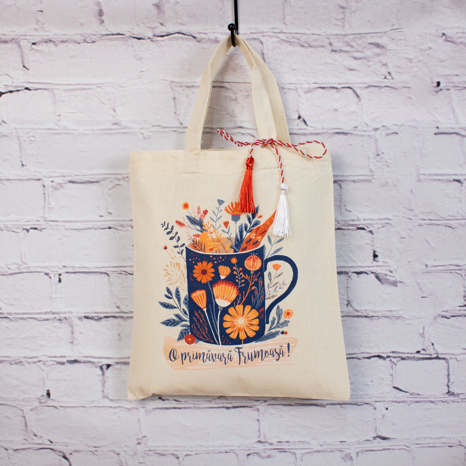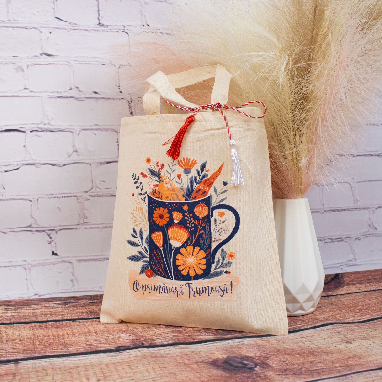 Sacoșă mărțișor textilă din bumbac, 22 × 26 cm – Cană plină cu primăvară  este un obiect de primăvară gândit să fie folosit, nu păstrat „pentru mai târziu”.