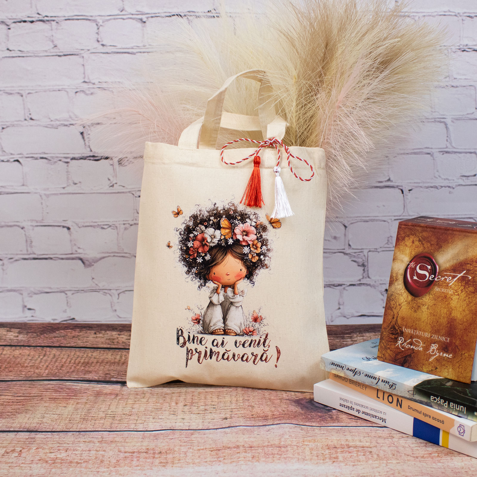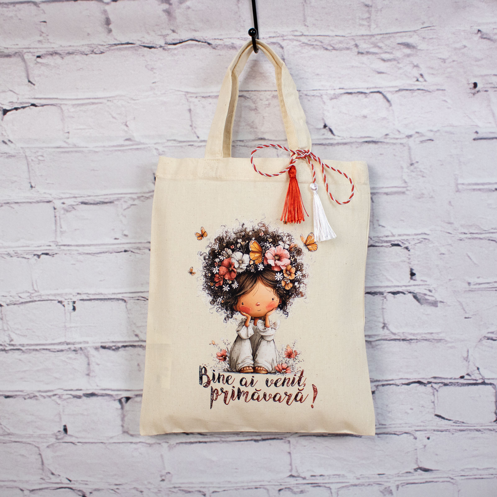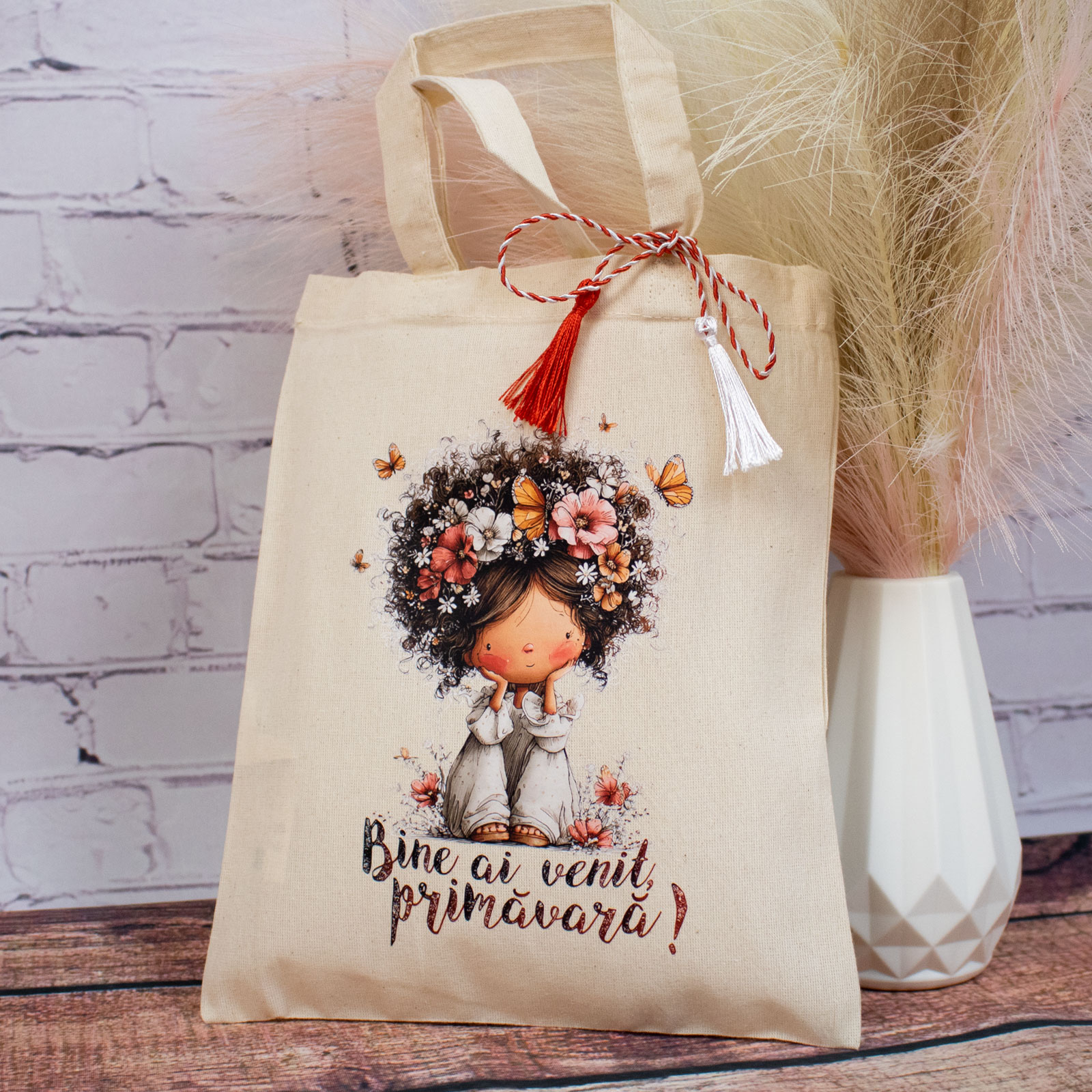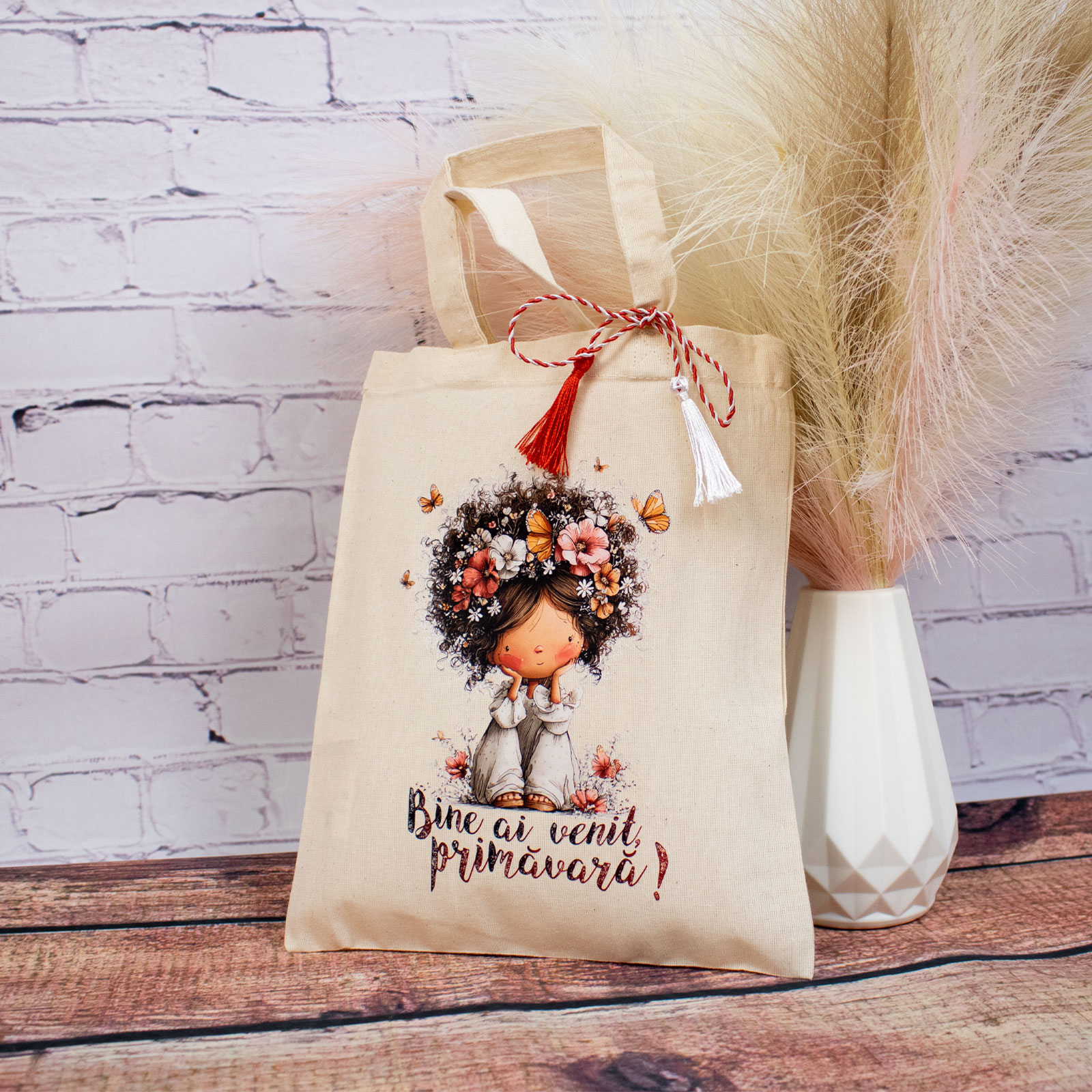 Sacoșă mărțișor textilă din bumbac, 22 × 26 cm – Fetița care a adus primăvara este un obiect de primăvară gândit să fie folosit, nu păstrat „pentru mai târziu”.