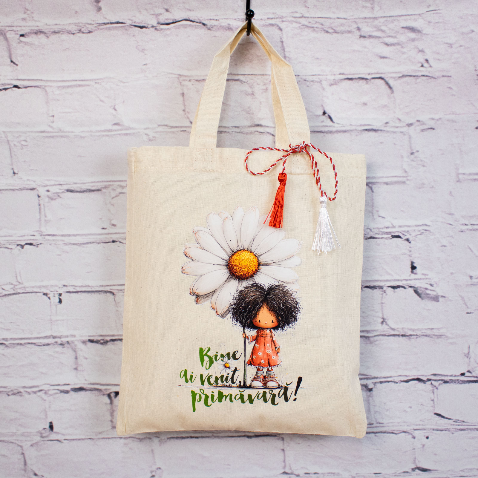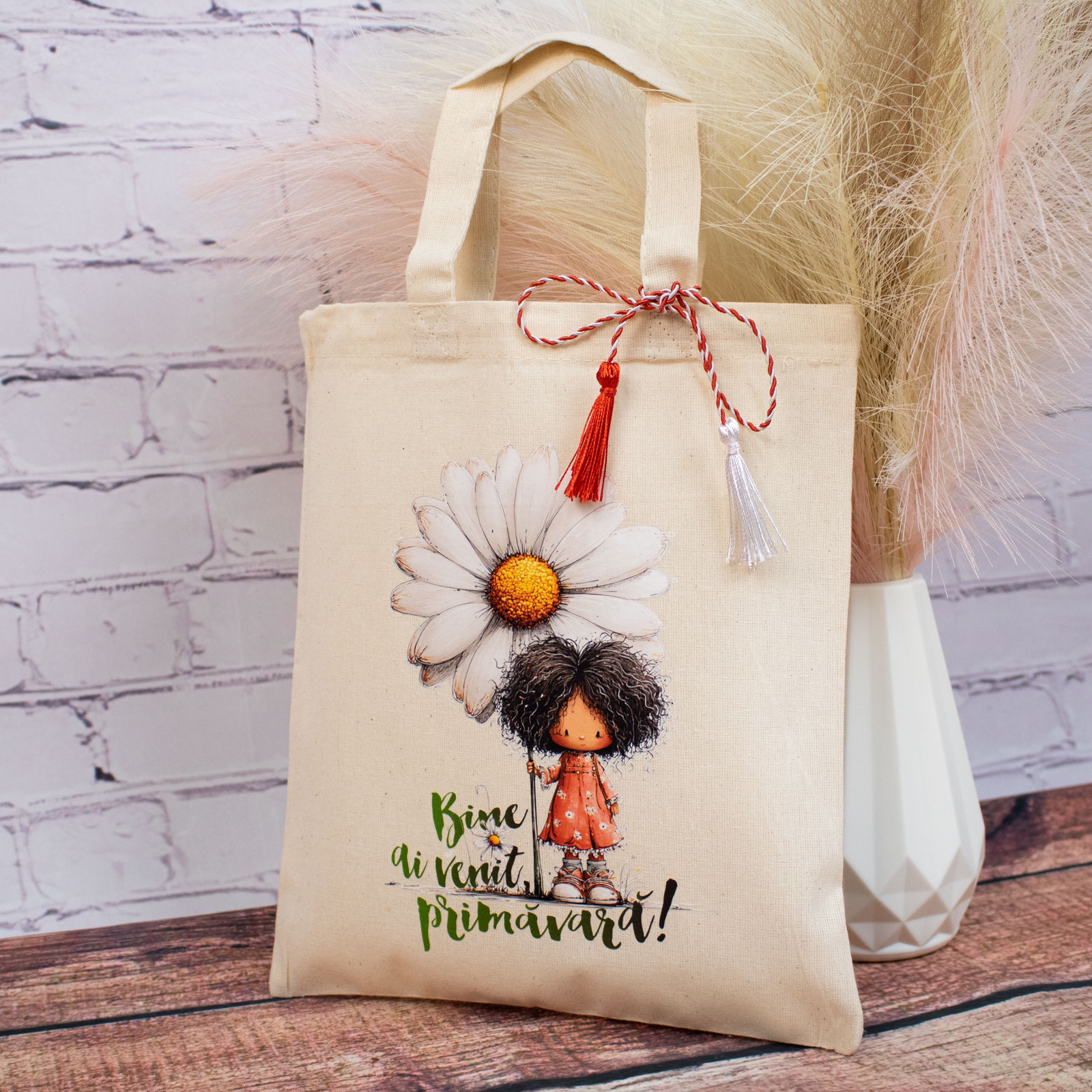 Sacoșă mărțișor textilă din bumbac, 22 × 26 cm – Fetița cu flori este un obiect de primăvară gândit să fie folosit, nu păstrat „pentru mai târziu”.