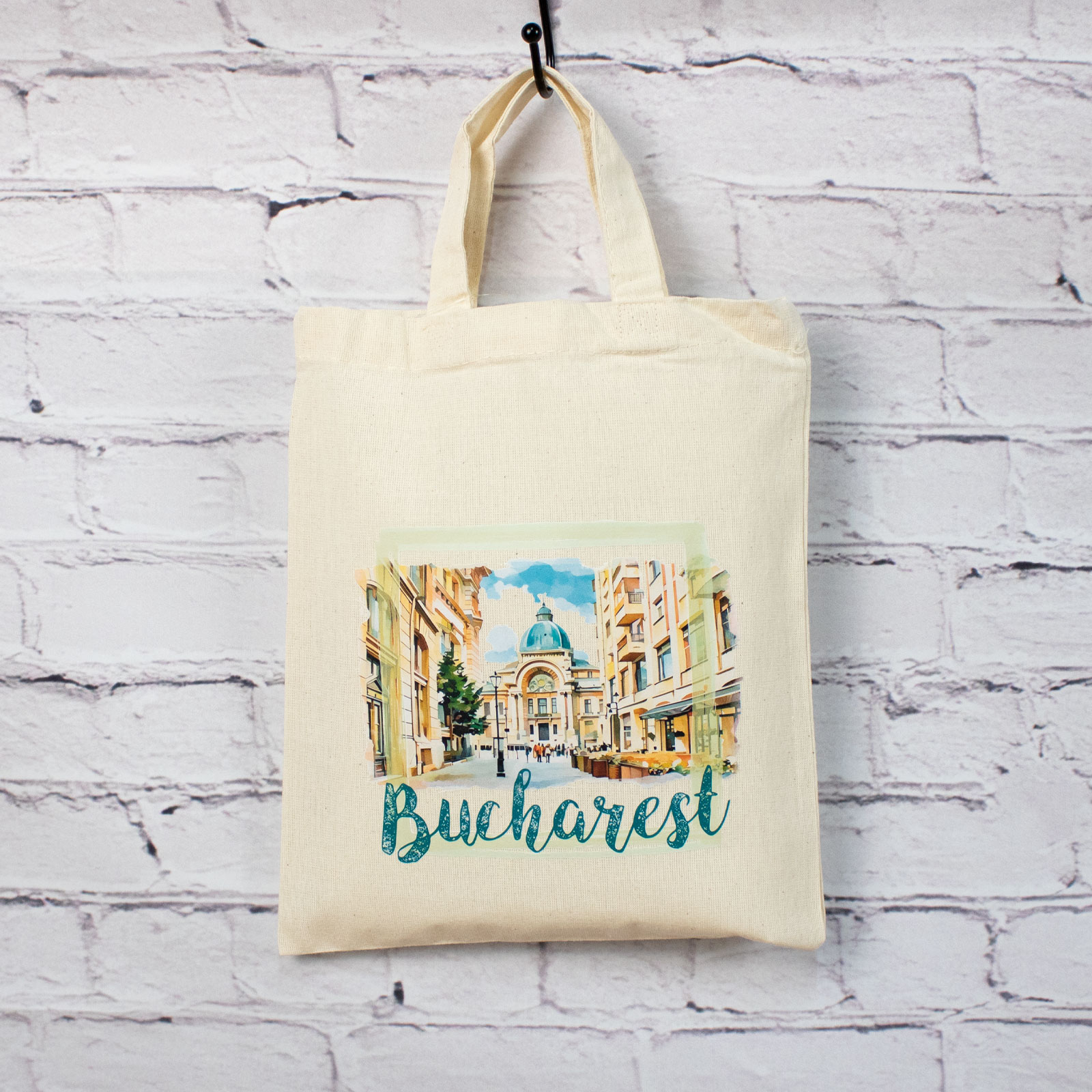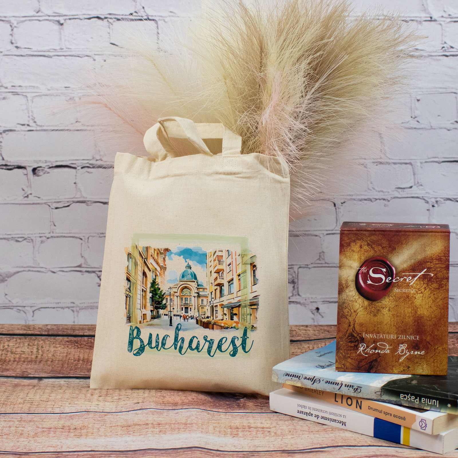 Sacosa din bumbac, suvenir, Palatul CEC Bucuresti (vedere din Centrul Vechi), dimensiune 22 x 26 cm este realizat din bumbac brut, atent alese pentru durabilitate și utilizare zilnică.