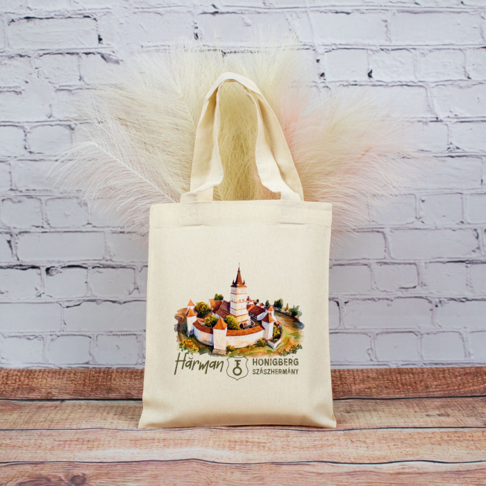 Sacosa din bumbac, suvenir, Biserica Evanghelica Fortificata Hărman, dimensiune 22 x 26 cm - un suvenir care păstrează povestea vie!