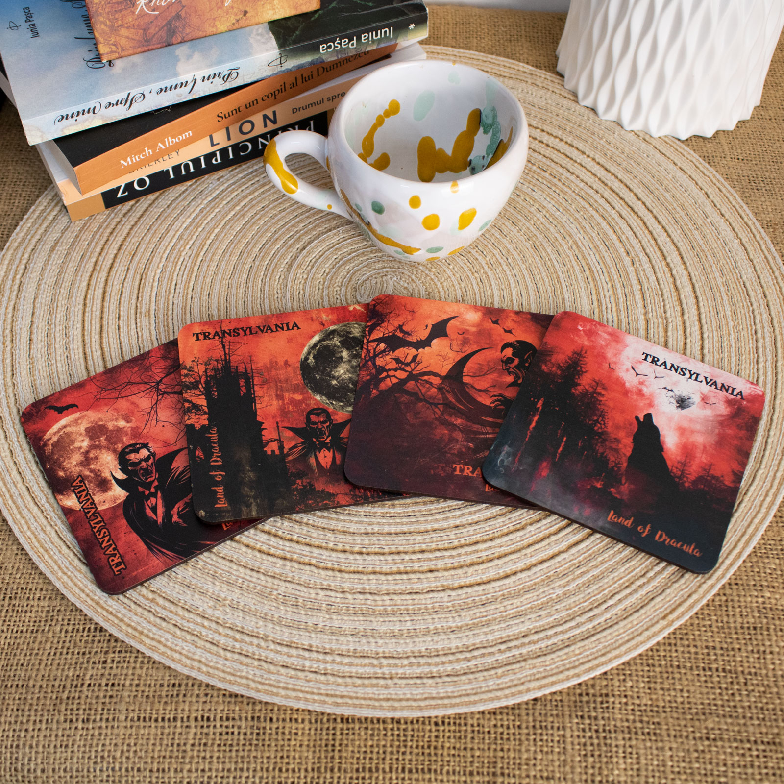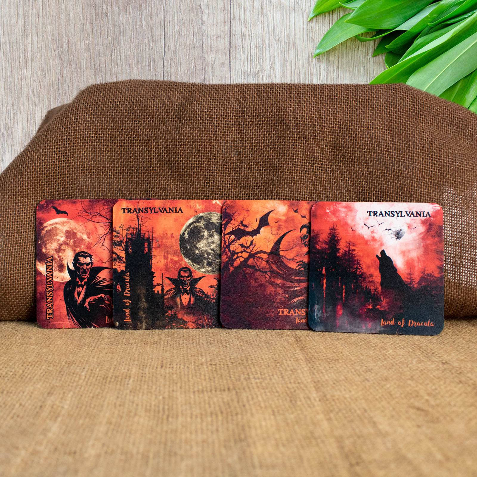 Suport pahare suvenir, din lemn, Mitul Dracula, Transylvania, Romania (set 4 bucati) - un suvenir care păstrează povestea vie!