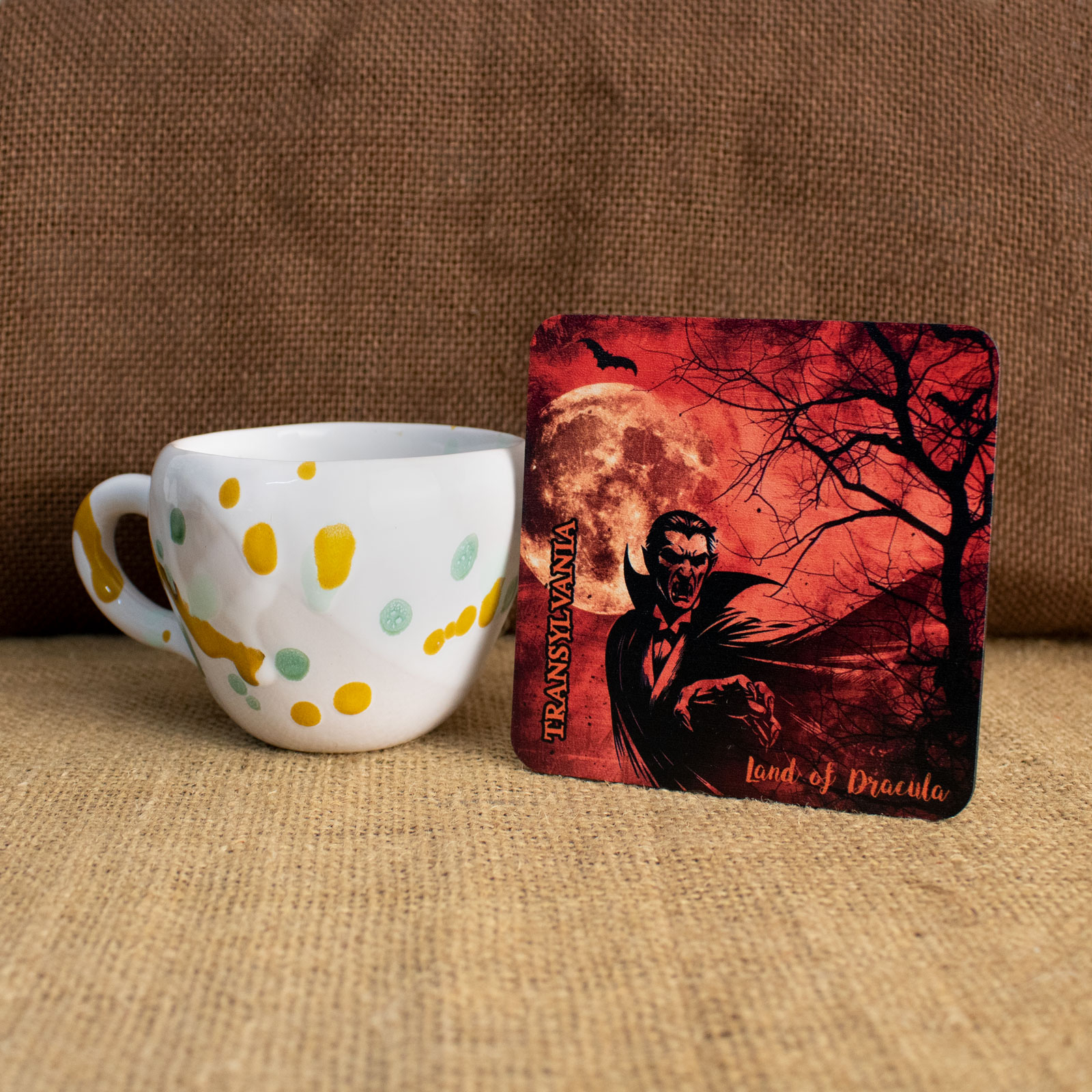 Suport pahare suvenir, din lemn, Transylvania, Romania, Mitul Dracula – un suvenir care păstrează povestea vie!