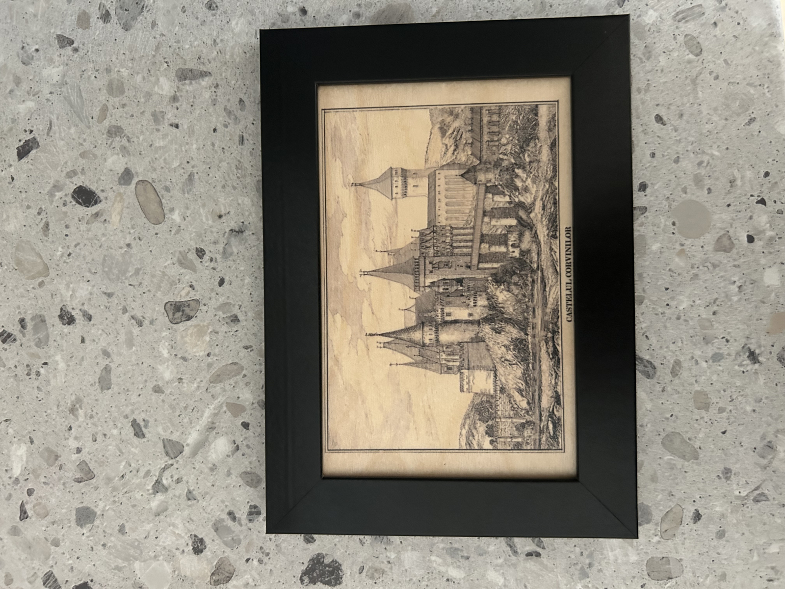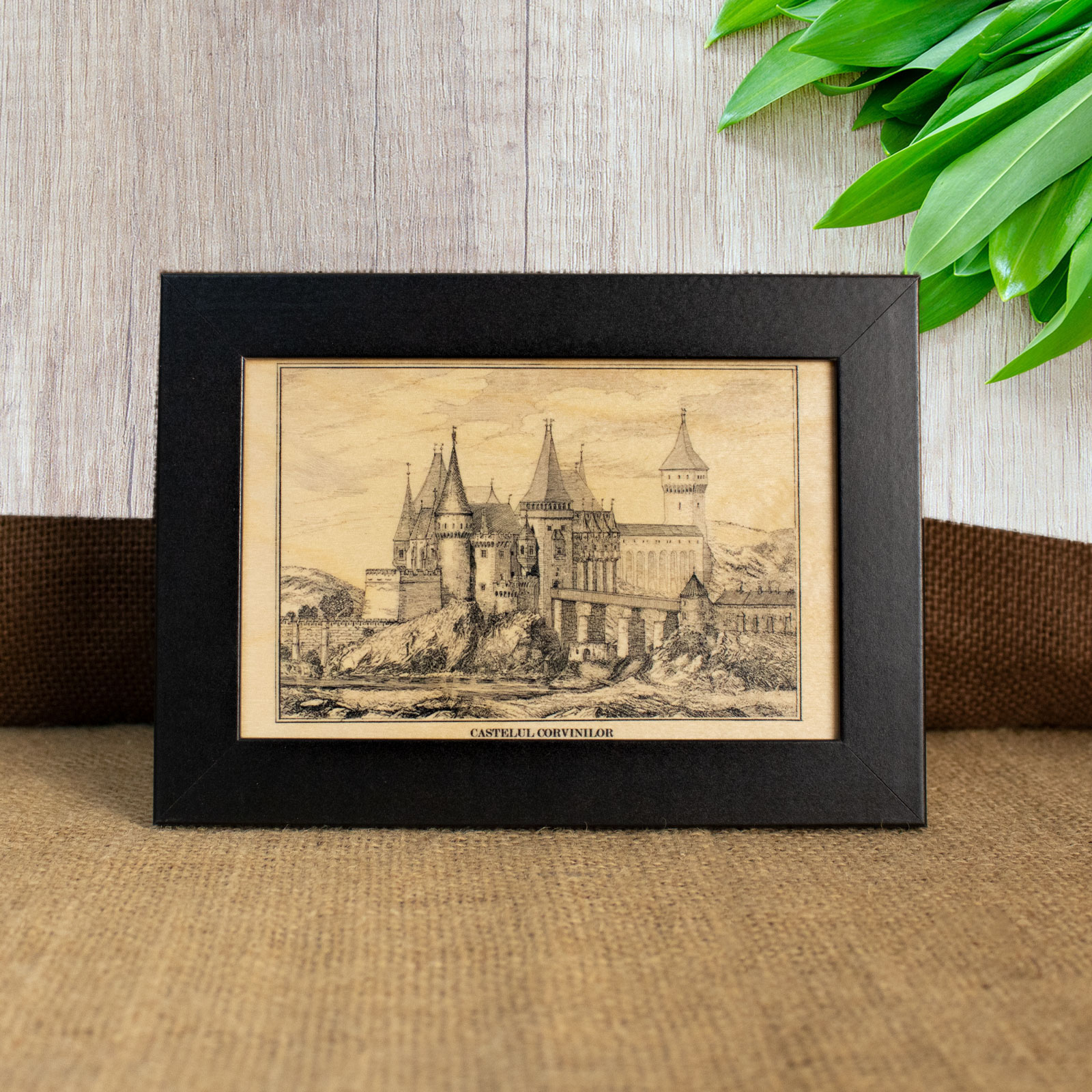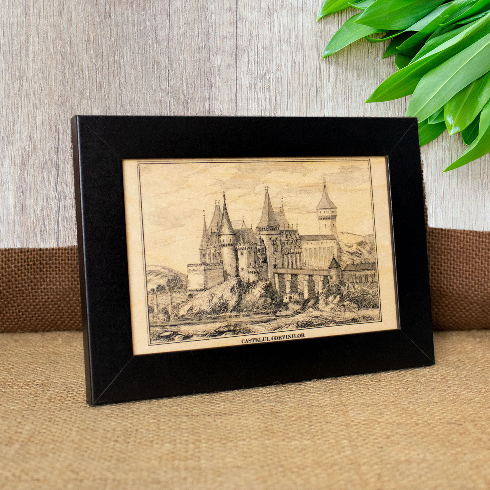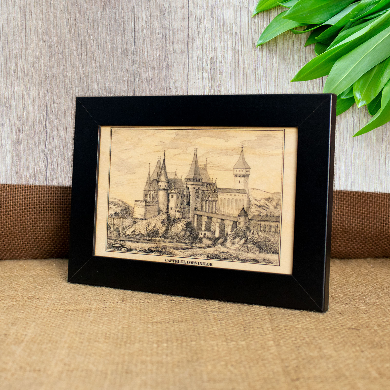 Produsul Tablou suvenir, din lemn, Castelul Corvinilor Hunedoara, dimensiune 10/15, rama inclusa este realizat in atelierul Craftlaser din Oradea